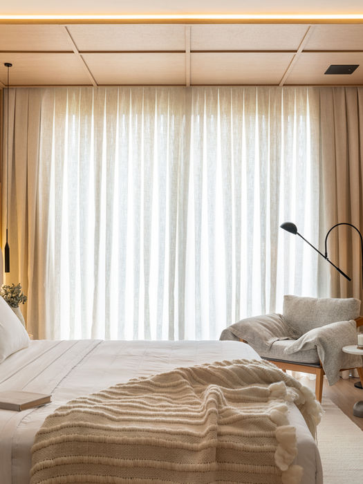 Na área íntima, a suíte principal tem acesso direto ao jardim, permitindo uma integração completa com o exterior. A grande porta de acesso é um convite para pisar na grama e aproveitar momentos de calma e conexão com a natureza. Cada detalhe do projeto foi pensado para trazer soluções que simplificam a rotina, sem abrir mão de conforto e estilo.